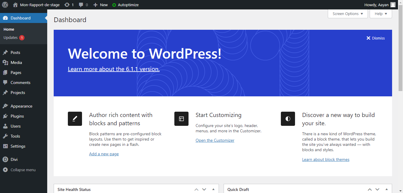 Voici la page d’accueil une fois qu’on se connecte en administrateur, on peut appercevoir  plusieurs onglets comme ‘Posts’ qui permet de gérér les posts si le site est un blog ou encore ‘Appearance’ qui permet de modifier les thèmes ou de personnaliser le menu par exemple, ou les couleurs.
